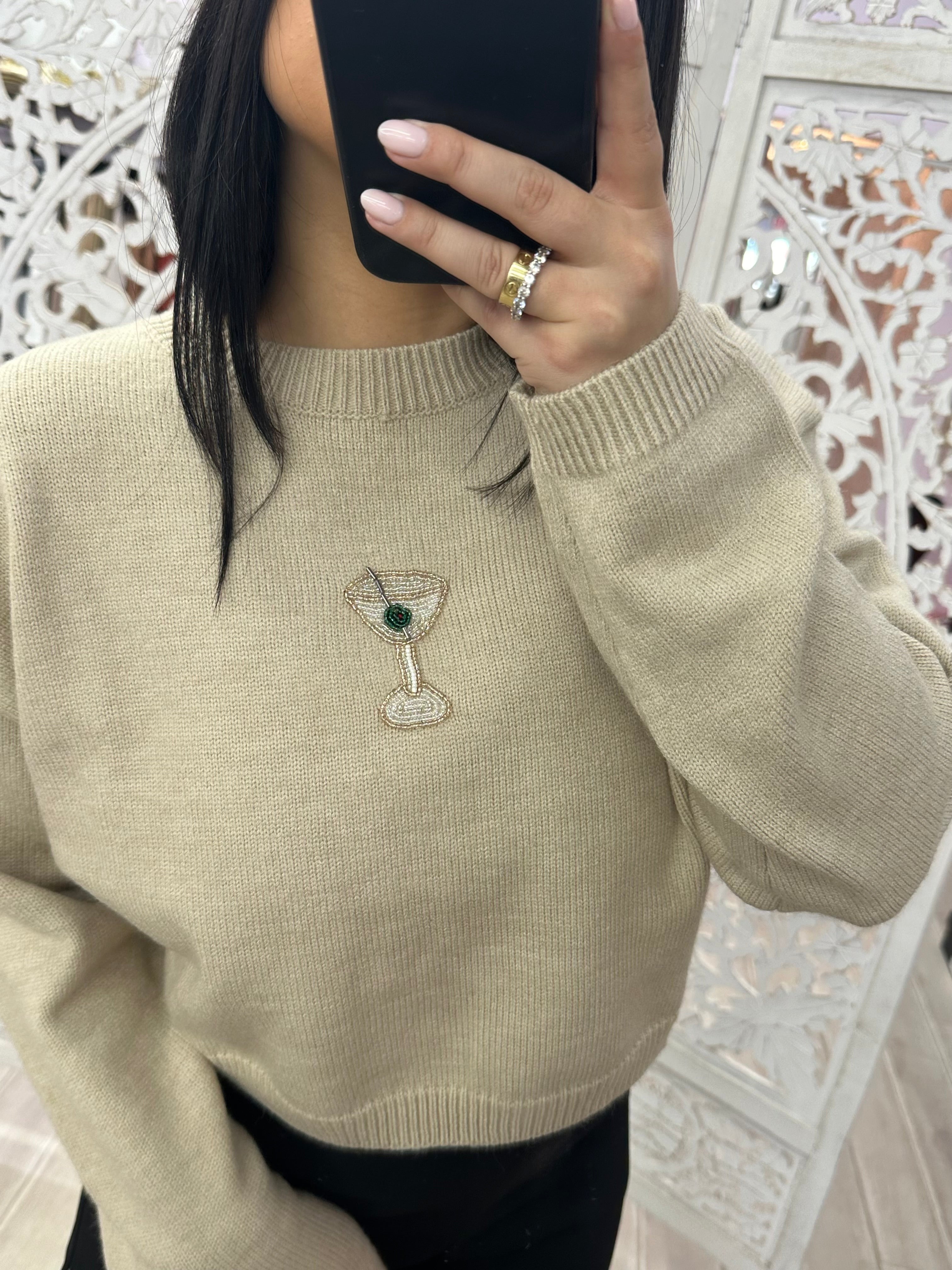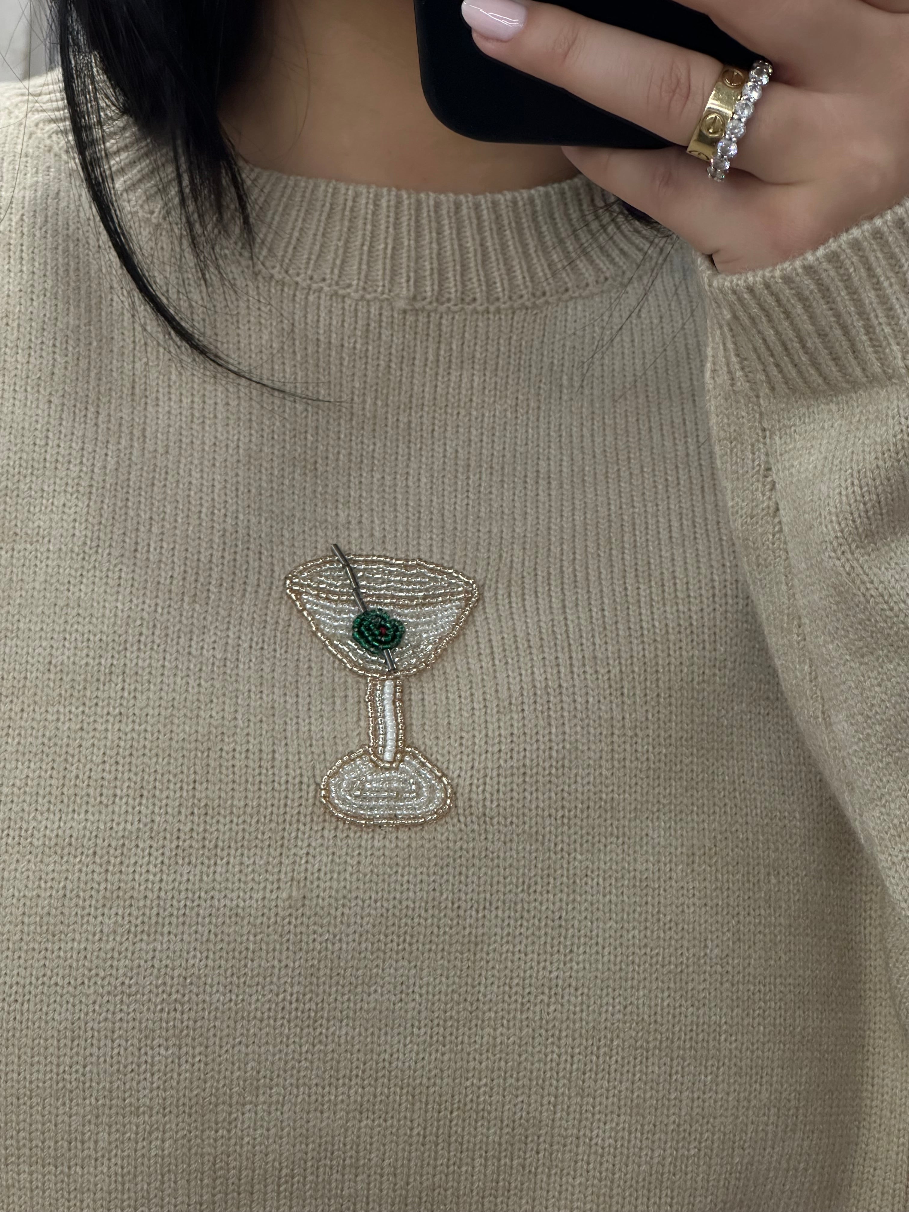 Get ready to shake things up in this playful top. It features a beaded martini embroidery for a quirky and fun touch. Stay cozy and stylish in this unique sweater.