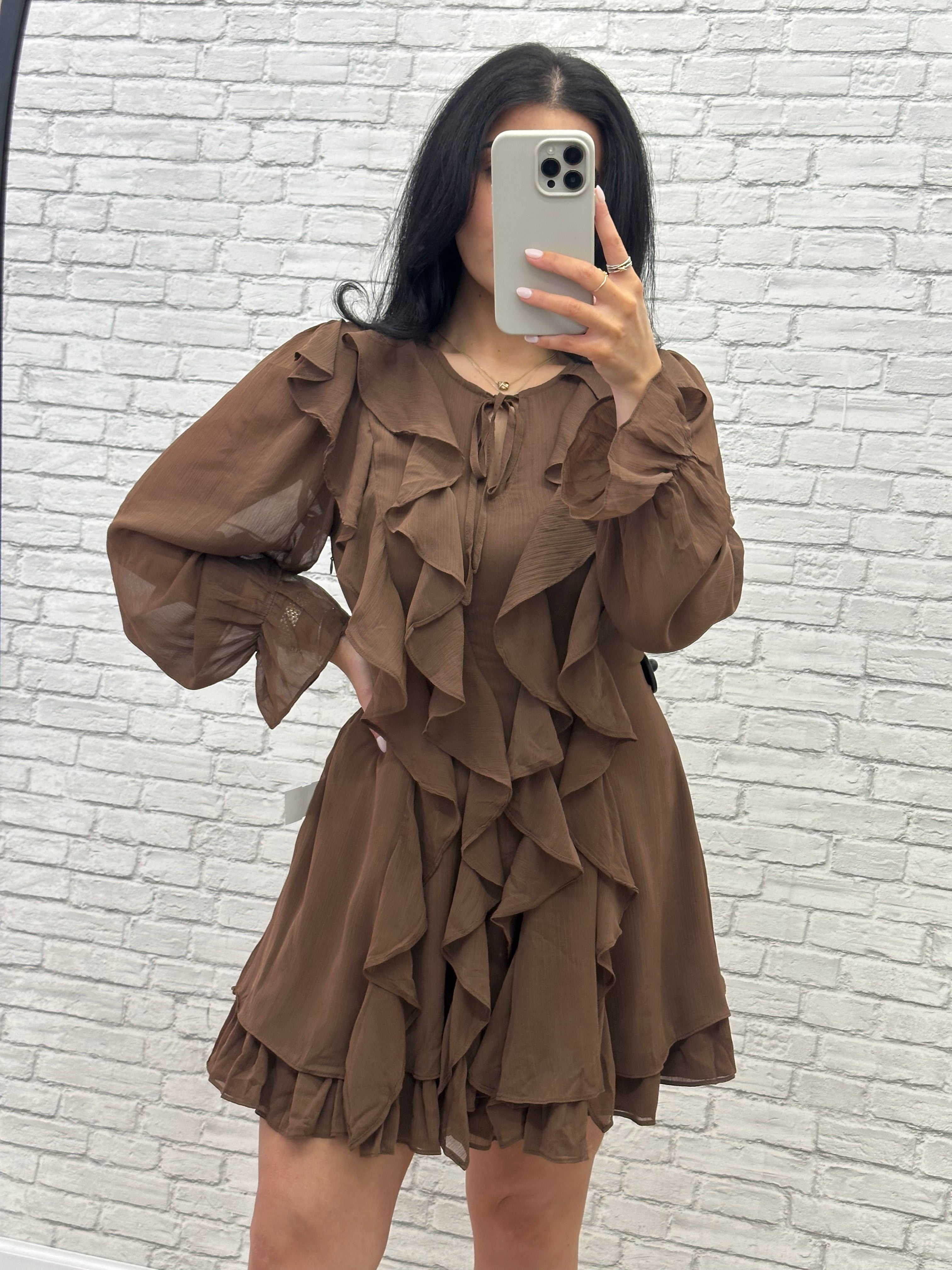 Effortless elegance meets playful charm in this chiffon ruffle dress. Sheer bell sleeves float beautifully, giving you movement and grace with every step. Perfect for occasions that call for something special yet wonderfully wearable!