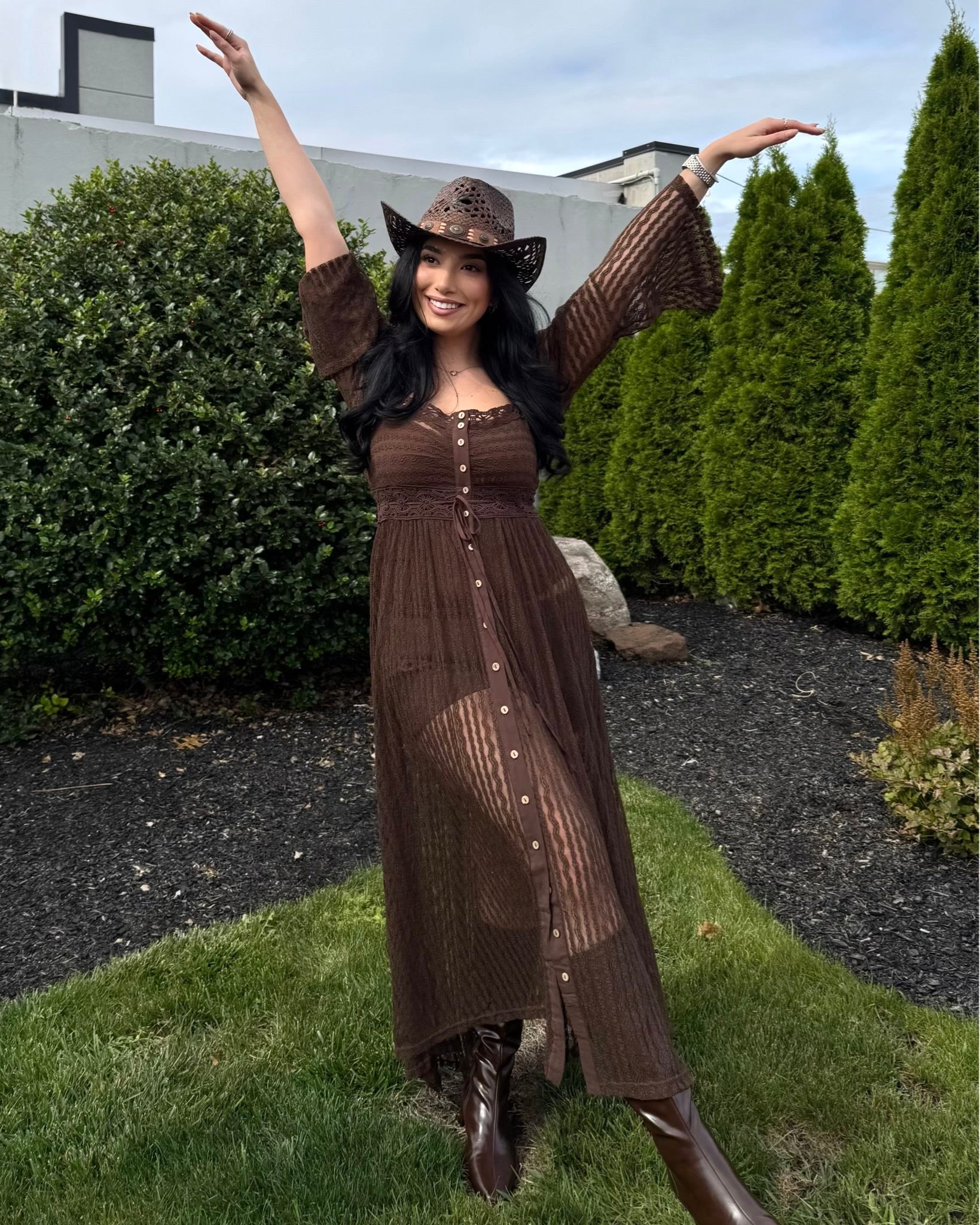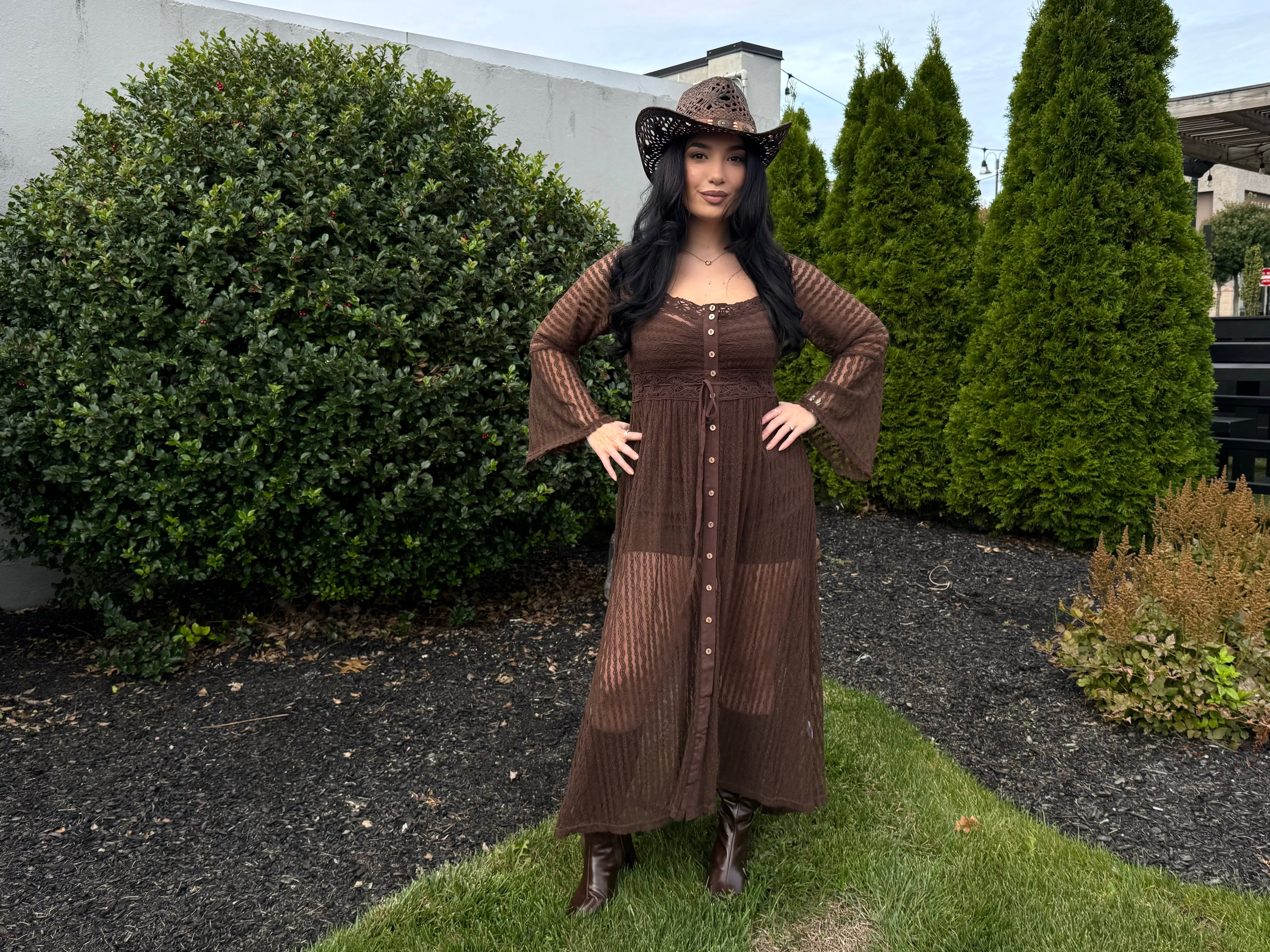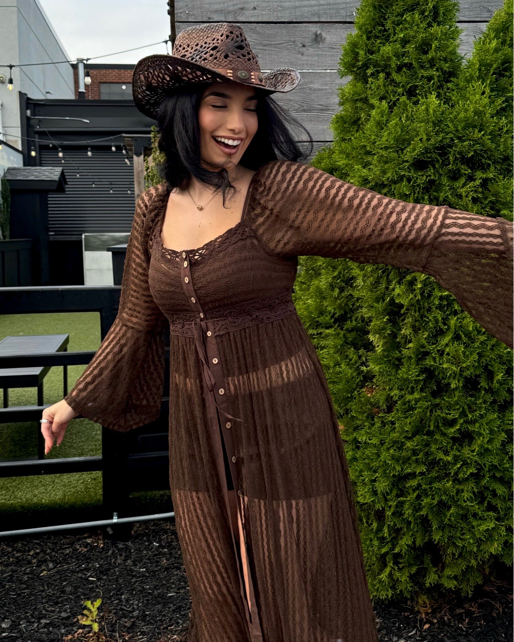 This chocolate lace duster combines feminine charm with modern details like bell sleeves. An adjustable drawstring and button closures provide the perfect fit and versatile styling. Ideal for anyone seeking a perfect piece for elegant layering.