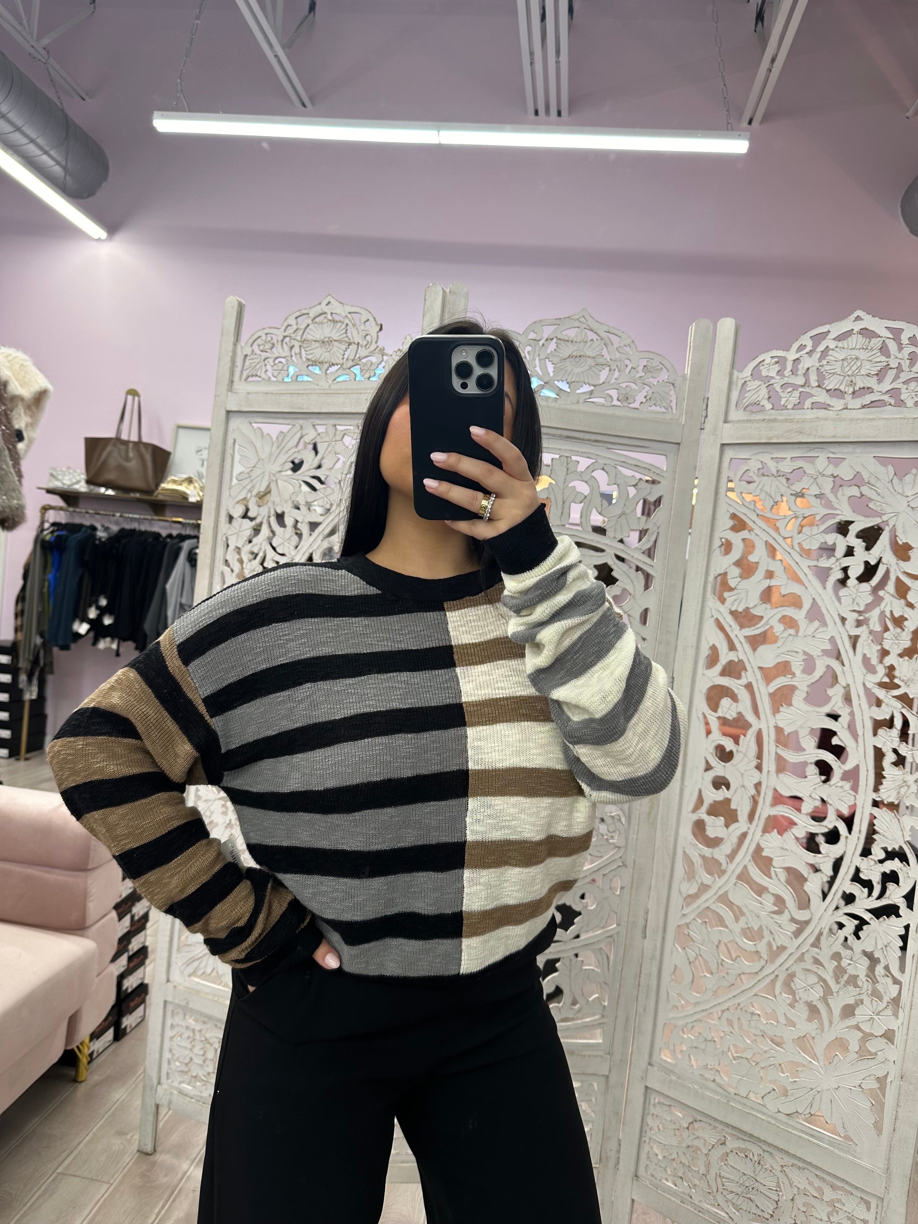 Keep it simple! This striped knit sweater with bold color contrast adds instant personality to your wardrobe. Cozy, versatile, and ready to become your favorite layering piece!