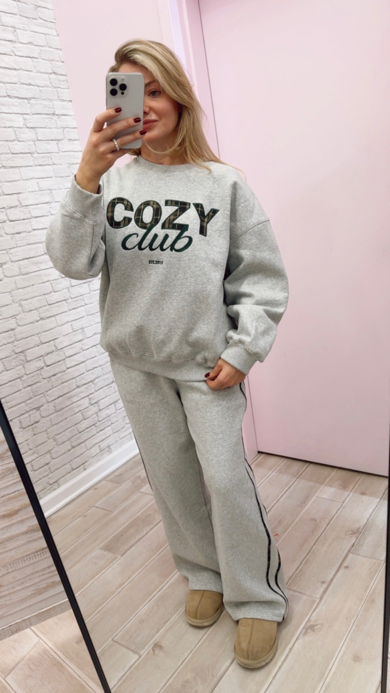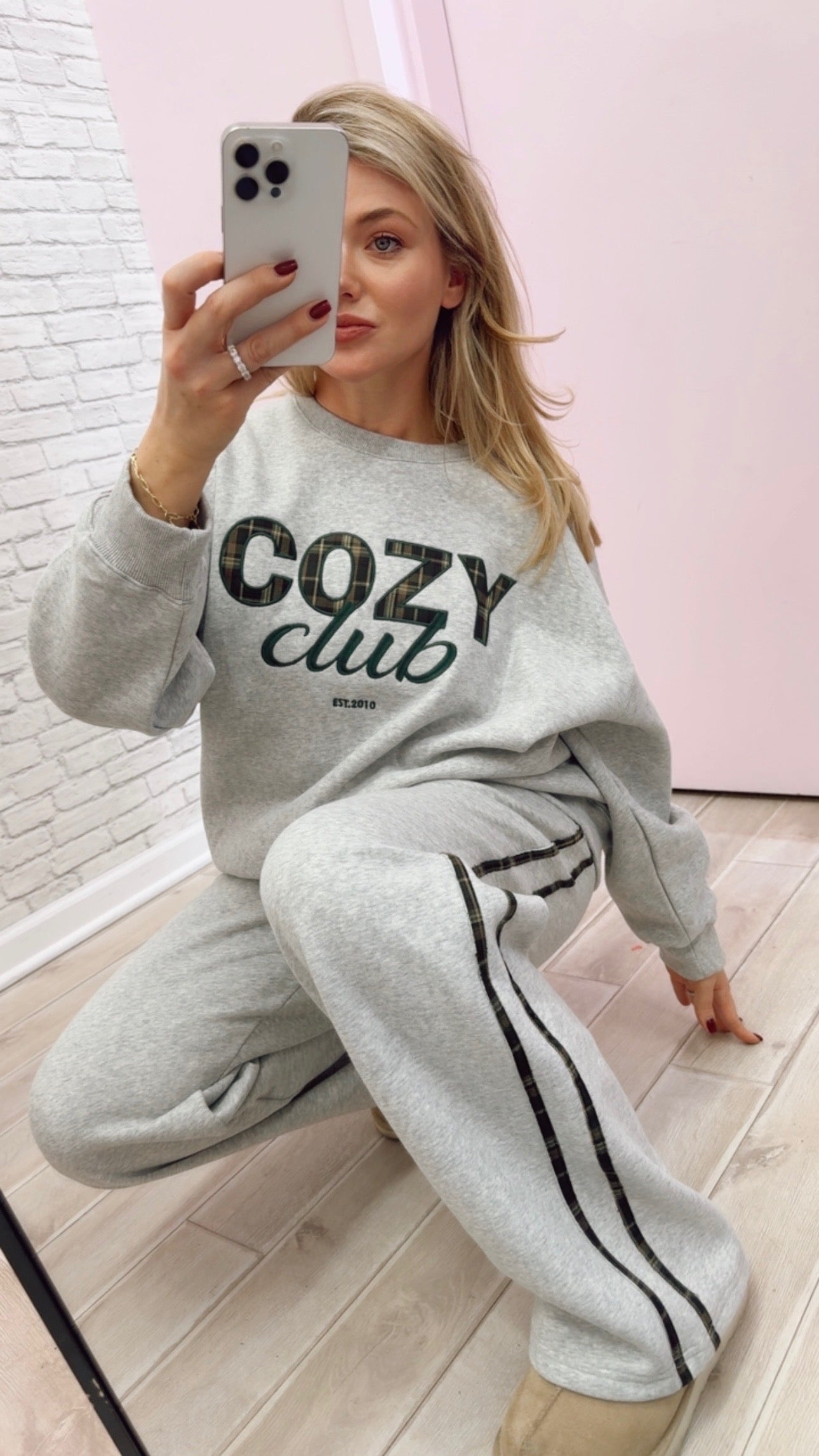 This embroidered "Cozy Club" sweatshirt is your new go-to for that perfectly relaxed, wrapped-in-warmth feeling. Grab the set and you're all set to embrace maximum coziness without sacrificing an ounce of style.
