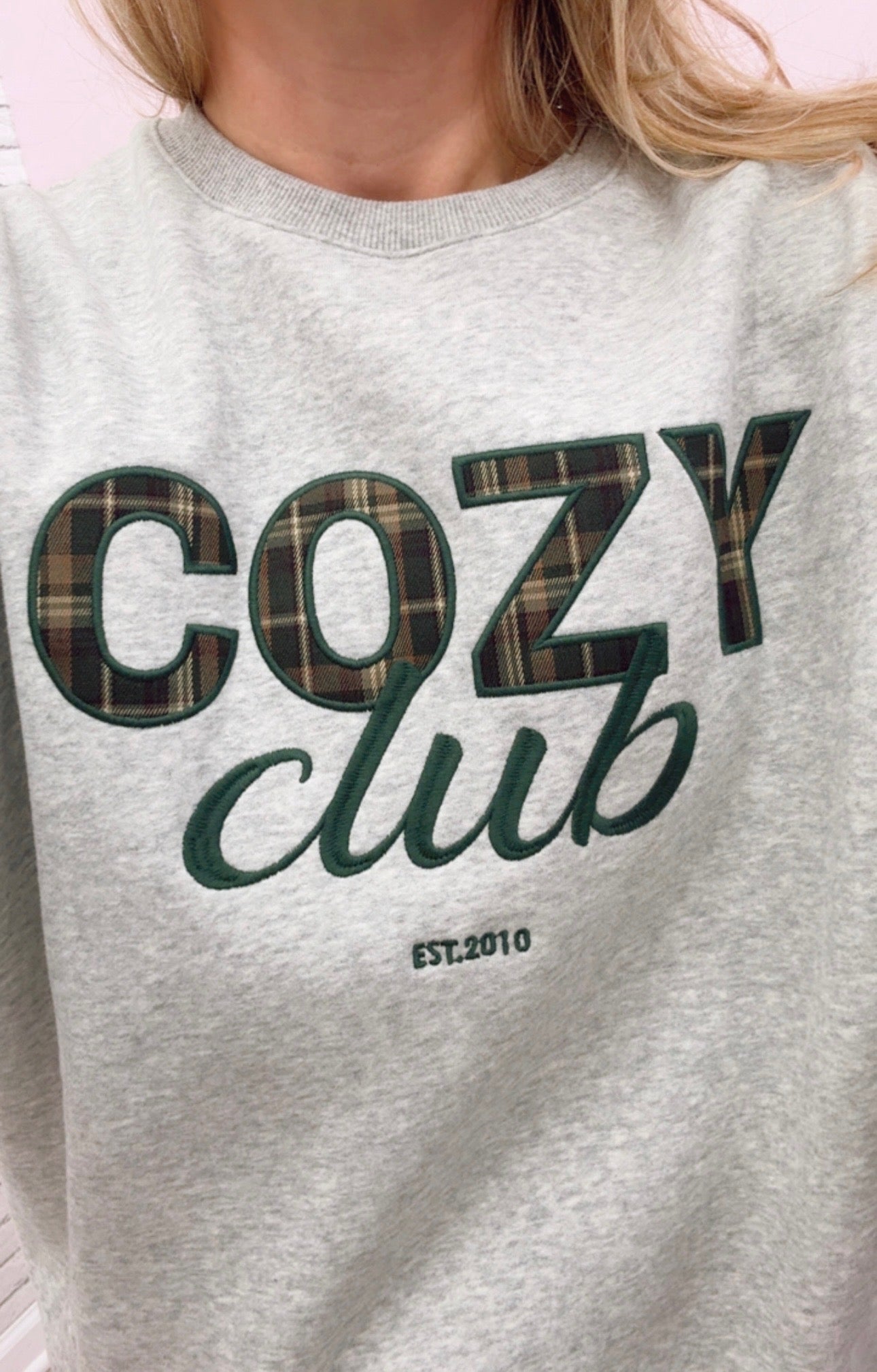 • Embroidered "Cozy Club" sweatshirt