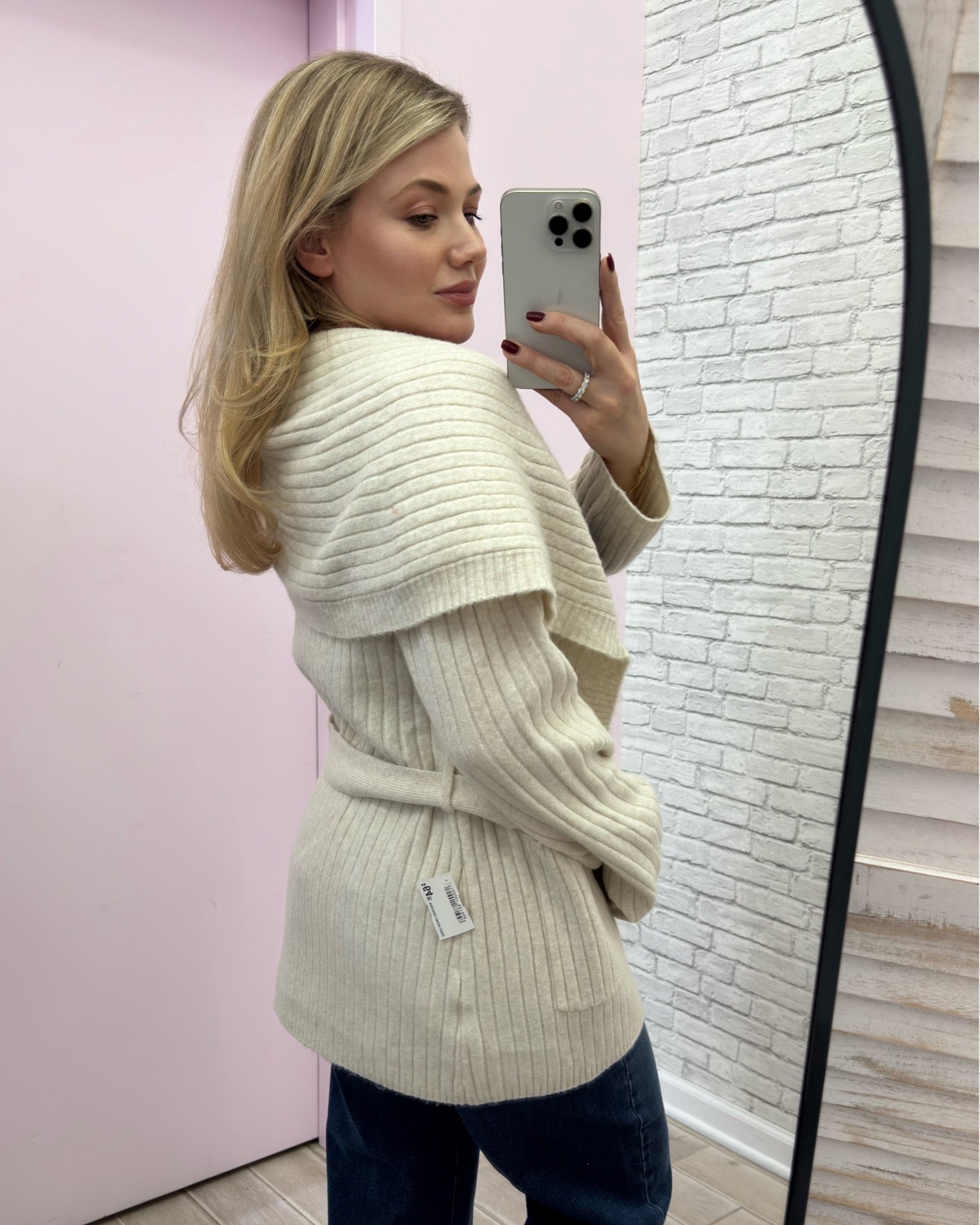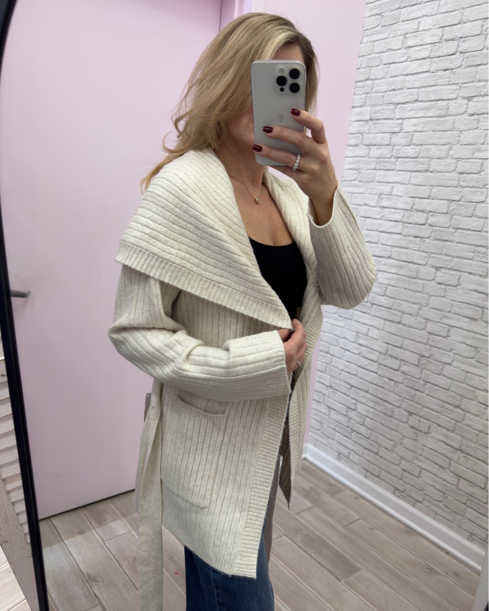 Elevate the everyday with this refined fold-over collar cardigan. It features a self-tie belt for effortless styling versatility and functional pockets for practical elegance. The structured collar adds a polished touch, making it equally at home layered over a dress or paired with tailored trousers. A sophisticated staple that transitions seamlessly.