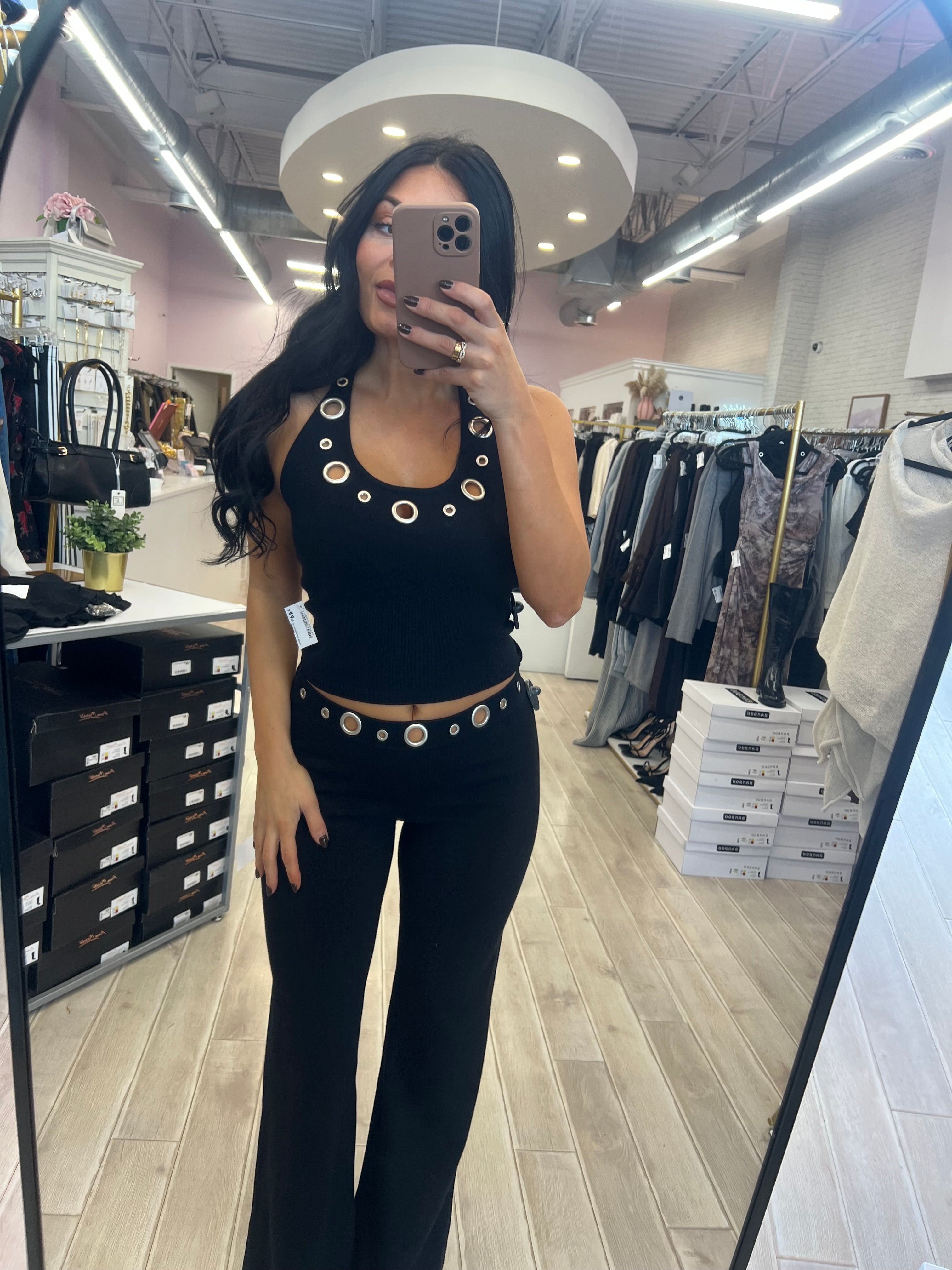 Meet your new go-to halter crop. The self-tie design fits just right while grommets add an edgy vibe that works for literally any occasion. Simple, cute, and totally distinct.