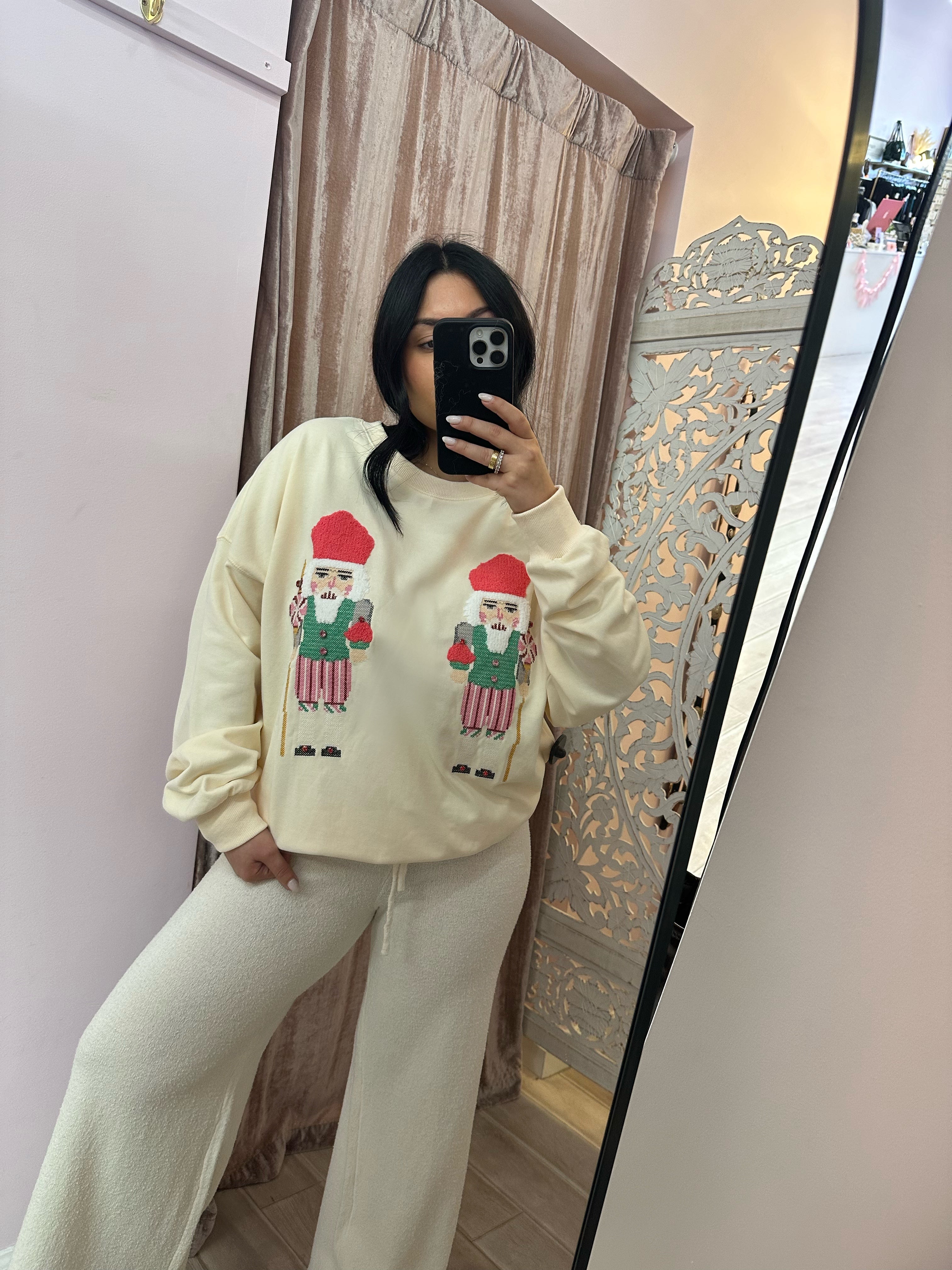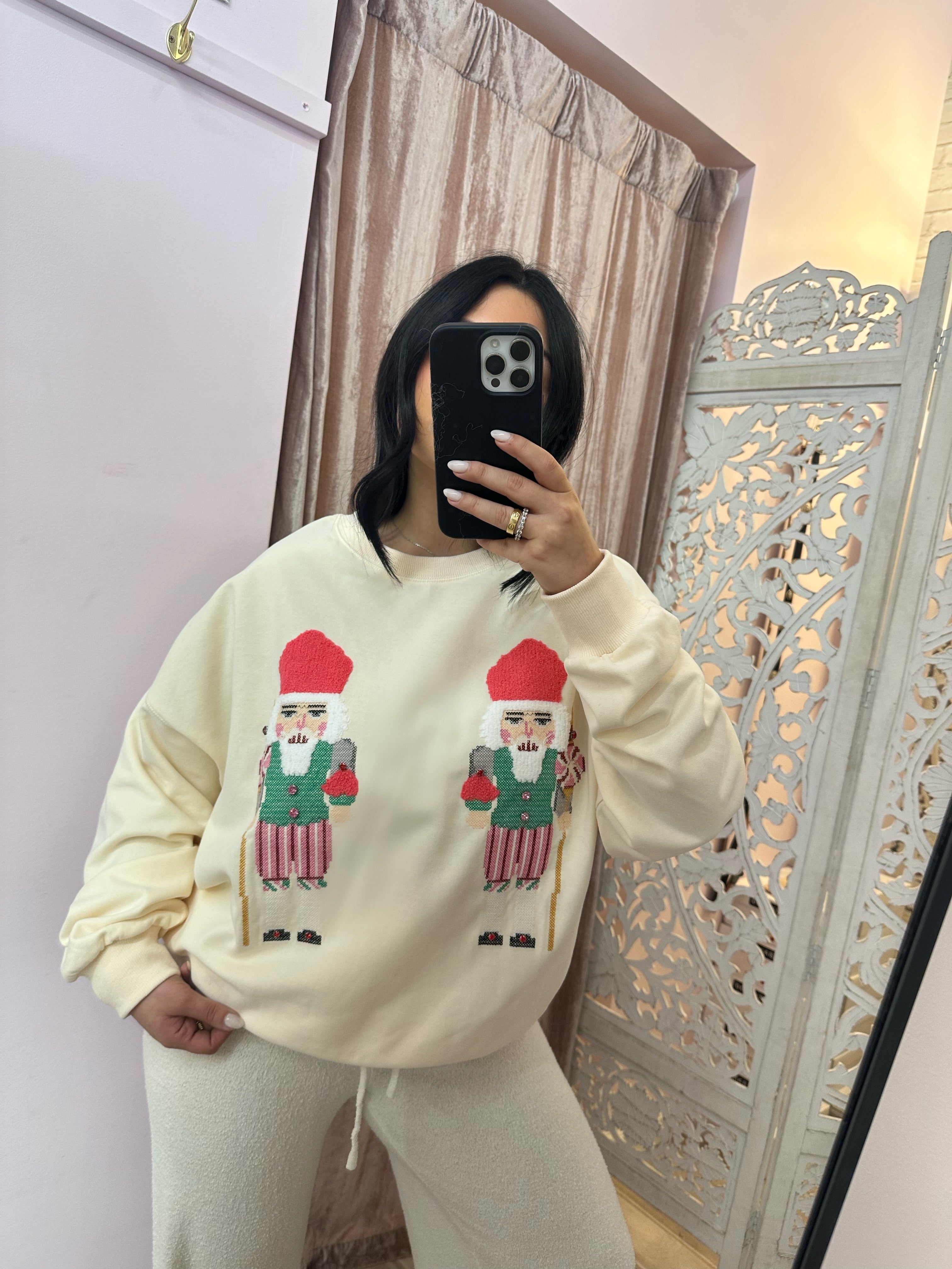 Embrace the festive spirit with this oversized holiday crewneck sweatshirt, featuring charming embroidered nutcrackers that dance across the full length. Perfect for cozy gatherings and merry celebrations!