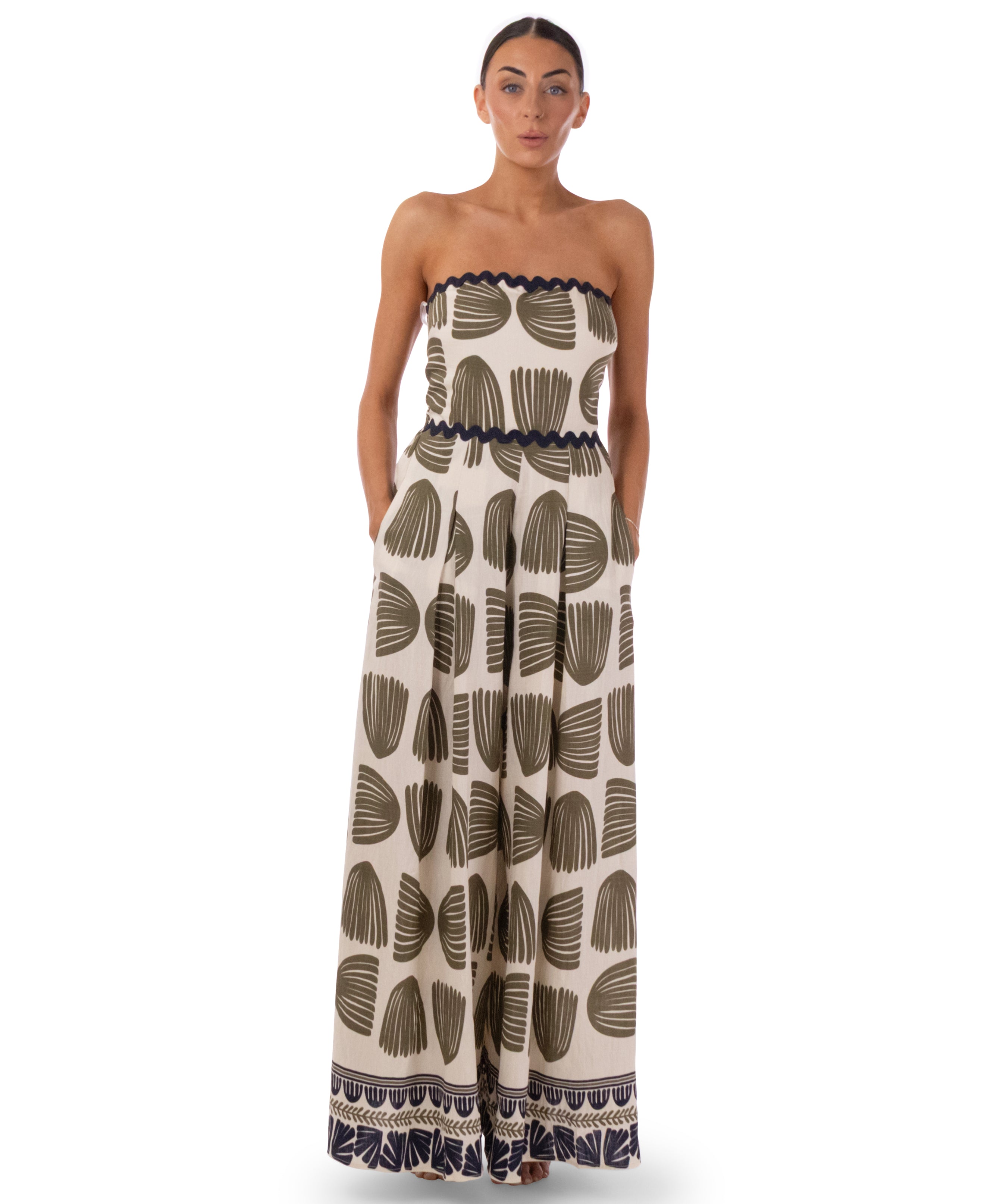 • Cream jumpsuit with dark green leaf print