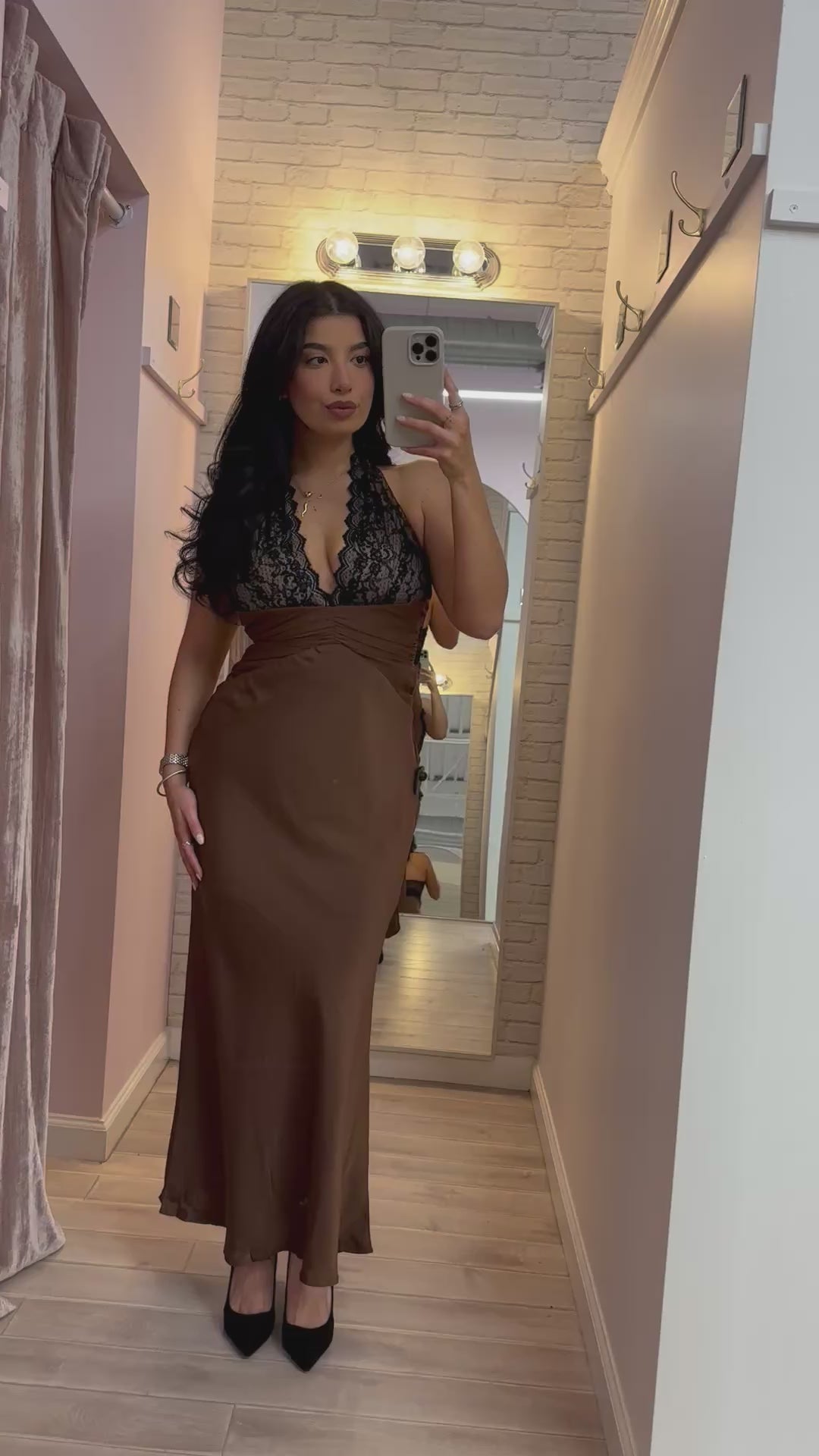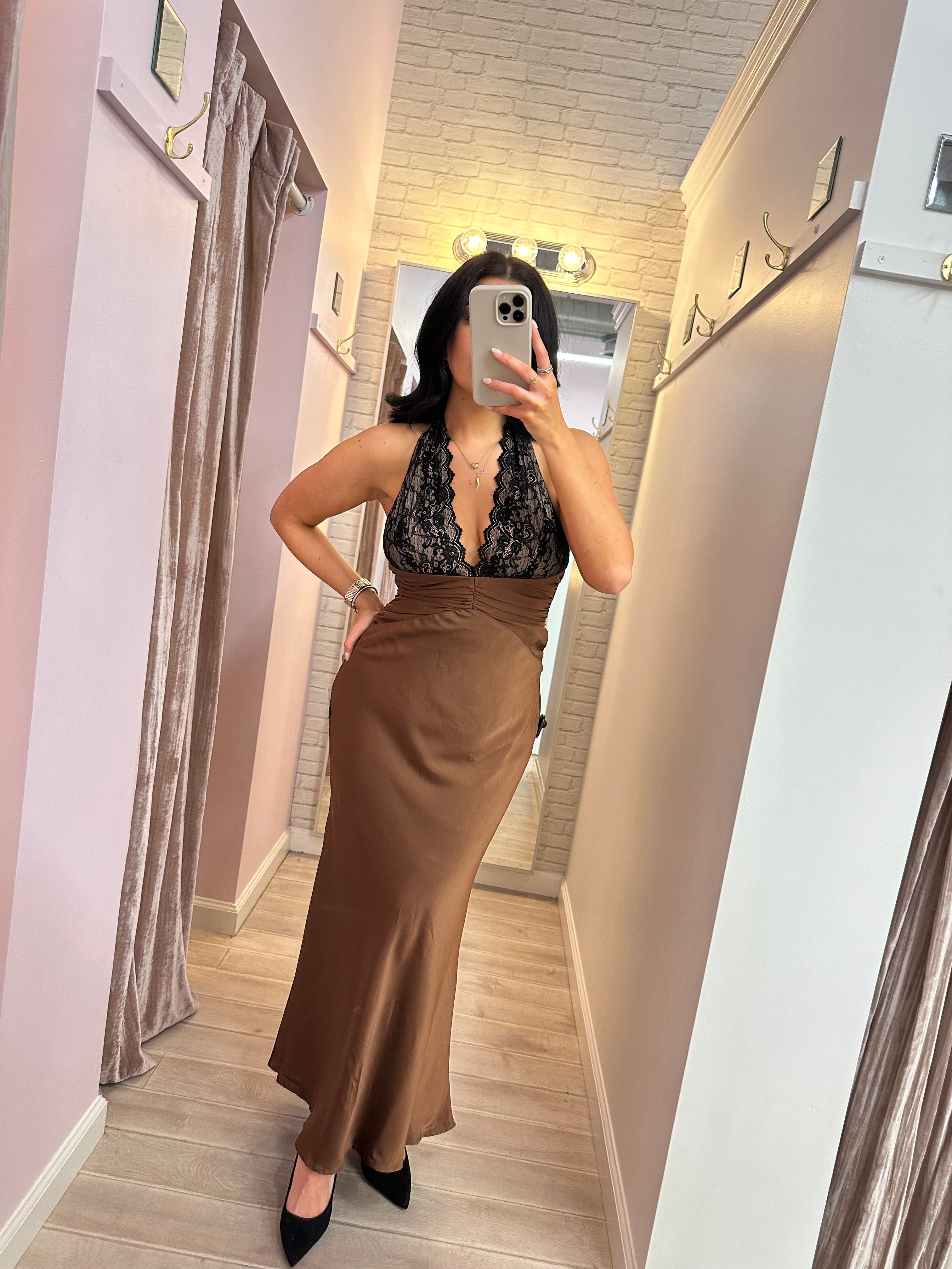 Elevate your evening with this sophisticated satin and lace halter maxi dress. The plunging neckline creates a striking silhouette, while the floral and scalloped lace bodice adds a refined texture. The halter design offers modern elegance with timeless appeal, making it a versatile addition to any refined wardrobe.