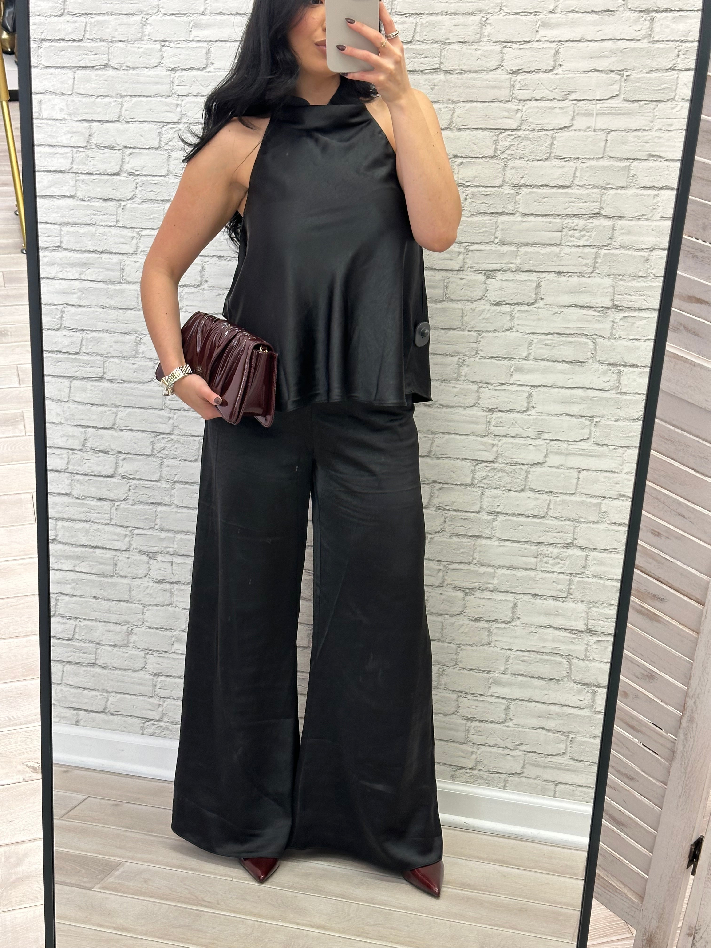 A stunning refined satin halter top, featuring a graceful high neckline and discreet button closure at the back. The luxurious fabric drapes beautifully for an effortlessly polished look. Available as a coordinated set to complete your ensemble with ease.