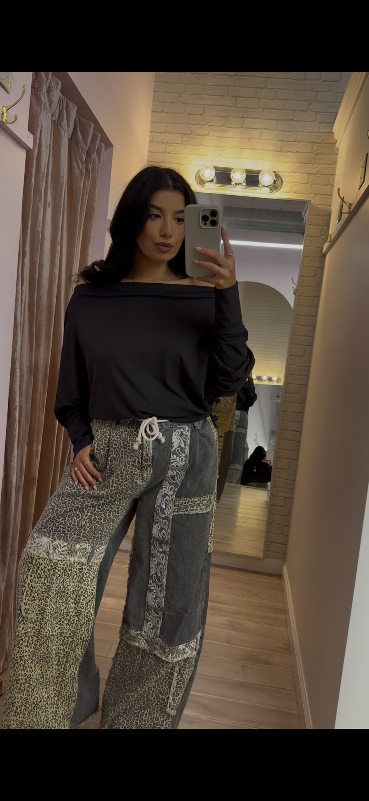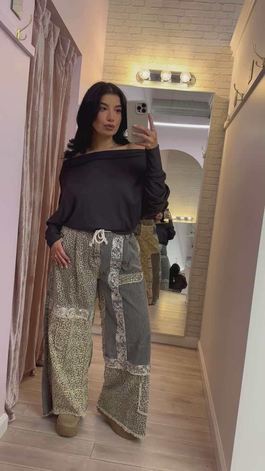 These patchwork leopard and gray denim pants deliver contemporary edge with thoughtful construction. A versatile foundation piece that elevates any wardrobe with understated confidence and visual interest.